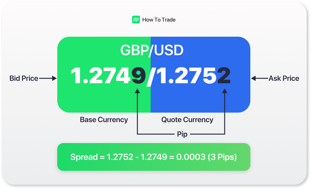 Spread is the difference between bid price and ask price. USD/JPY would be 110.00/110.04. This quote indicates a spread of 4 pips. Bid Price – The “bid” is the price at which you can SELL the base currency. Ask Price – The “ask” is the price at which you can BUY the base currency.